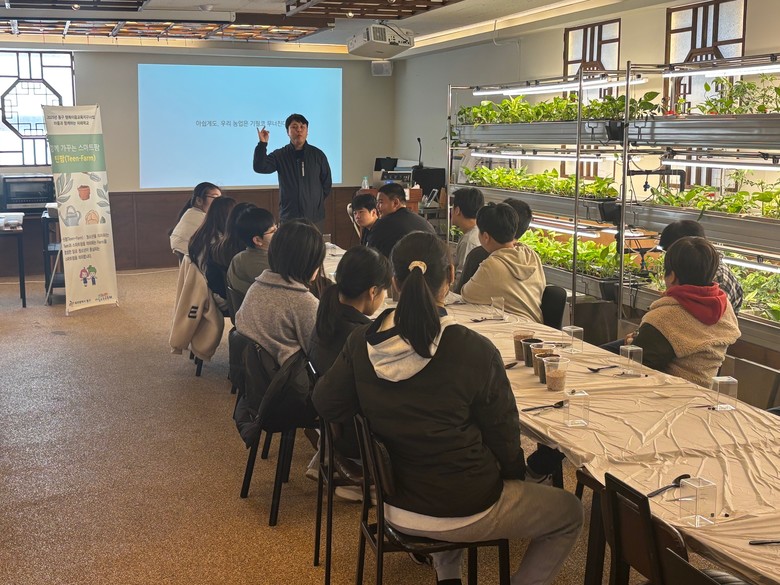 ‘틴팜(Teen-Farm)’은 청소년을 뜻하는 Teen과 스마트팜을 의미하는 Farm을 결합한 명칭으로, 지역 청소년들이 친환경 농업의 가치와 기후변화 대응의 중요성을 실제 체험을 통해 배우도록 기획된 교육 프로그램이다. 이번 프로그램은 동구 관내 초등학교 5~6학년 및 중학교 학급 중 희망 학급을 대상으로 진행하였으며, 기후 위기 이해, 친환경 스마트팜 기술 학습, 환경·농업 문제 해결을 위한 실습 활동 등이 단계적으로 운영되었다.
