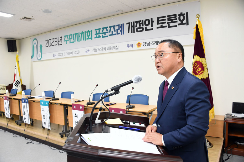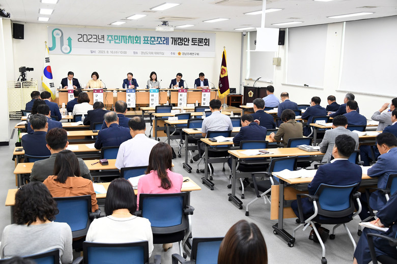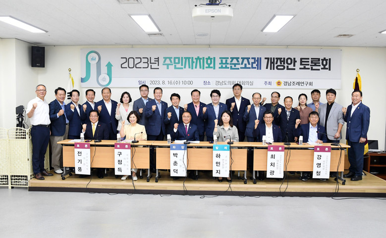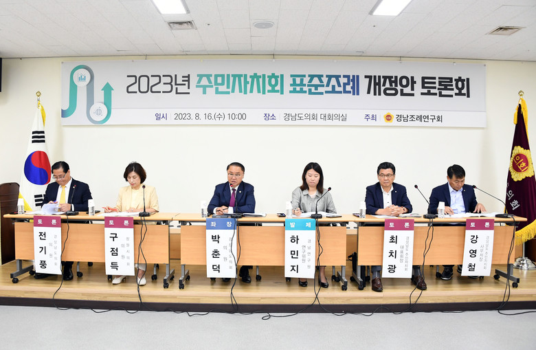 [경남 세계타임즈=최성룡 기자] 경상남도의회 의원 연구단체 경남조례연구회(회장 박춘덕 의원)가 8월 16일 도의회 대회의실에서 ‘2023년 주민자치회 표준조례 개정안’에 대한 토론회를 개최했다.