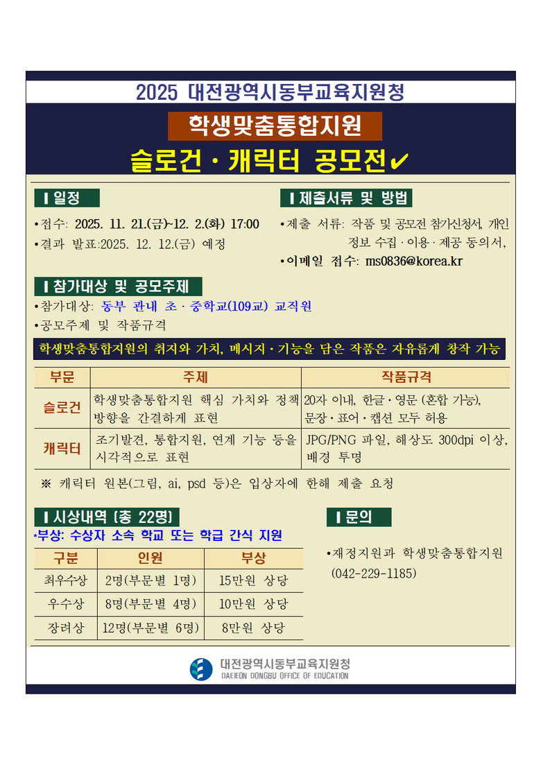 대전동부교육지원청 이상진 재정지원과장은“이번 슬로건과 캐릭터 공모전을 통해 정책의 핵심 가치가 시각적으로 공유되고, 학교 현장에서 보다 친숙하고 실천 가능한 학생맞춤형 지원 문화 확산의 기반이 될 것으로 기대한다”고 말했다.