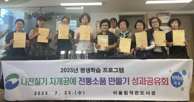 [서구 세계타임즈=이용우 기자] 부산 서구 남부민2동 주민자치회(위원장 정성태)는 지난 23일, 평생학습센터 프로그램 「나전칠기 자개 공예 전통 소품 만들기」 수료식을 개최하고 직접 만든 자개 공예 작품을 전시하였다. 해당 프로그램은 지역 주민을 대상으로 어울림작은도서관에서 5월부터 7월까지 운영하였다.