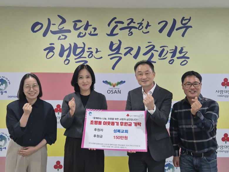 이기영 초평동장은 “어려운 이웃을 위해 꾸준히 나눔을 실천해 주시는 오산성복교회에 깊이 감사드린다”며 “기탁된 성금은 도움이 필요한 주민들에게 소중히 전달해 희망과 용기가 될 수 있도록 하겠다”고 말했다.