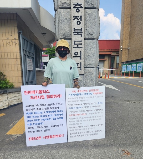 매립지 인근에 사는 또 다른 주민 B씨는 남편이 위중한 병을 앓고 있어 맑은 공기를 찾아 이곳으로 이사와 요양중에 있는데 살고 있는 집 300m 앞에 폐기물 매립을 한다는 소식을 듣고 30도 이상 되는 폭염속에서도 충북도청은 물론 진천군청 앞에서도 폐기물매립지 철회를 요구하며 1인시위를 하고 있다,