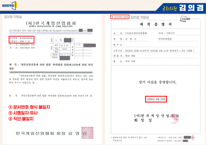 또 이 협회 김영만 회장의 이름을 기재하는 방법도 김건희 씨 문서에는 “(사)한국게임산업협회 회장 김영만”으로 (사)라는 기호를 표시하고 두 줄로 쓰여진 반면에, 문체부 공식 문서는 (사) 표시 없이 한 줄로 기재하는 방식이었다.