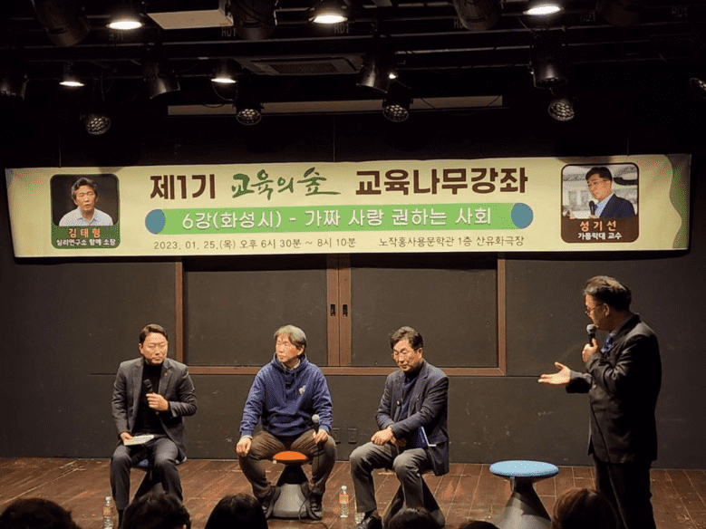 ‘제1기 교육의숲 교육나무강좌’ 제6강 김태형 소장의 ‘가짜 사랑 권하는 사회’ 강연회에는 화성시민과 교육 관계자, 손택수 노작홍사용문학관 관장, 조대현 전 총리 민정실장 등 70여 명이 참석했다.