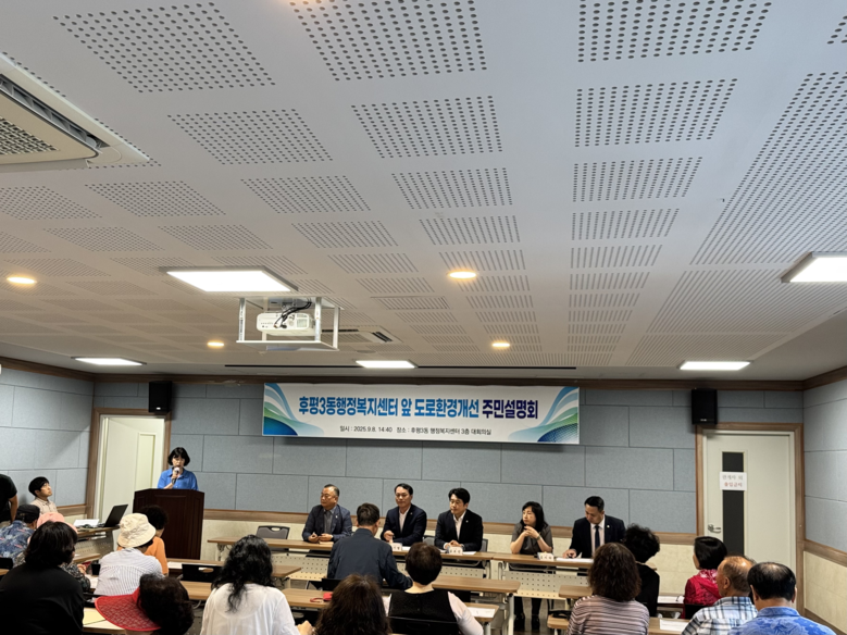 [강원도 세계타임즈=김민석 기자] 박기영 강원특별자치도의원이 9월 8일(월) 후평3동 행정복지센터 3층 대회의실에서 “후평3동 행정복지센터 앞 도로 환경 개선 주민설명회”를 열고, 후평3동 행정복지센터 인근 도로 환경 개선 사업을 위한 도비 지원을 약속했다.