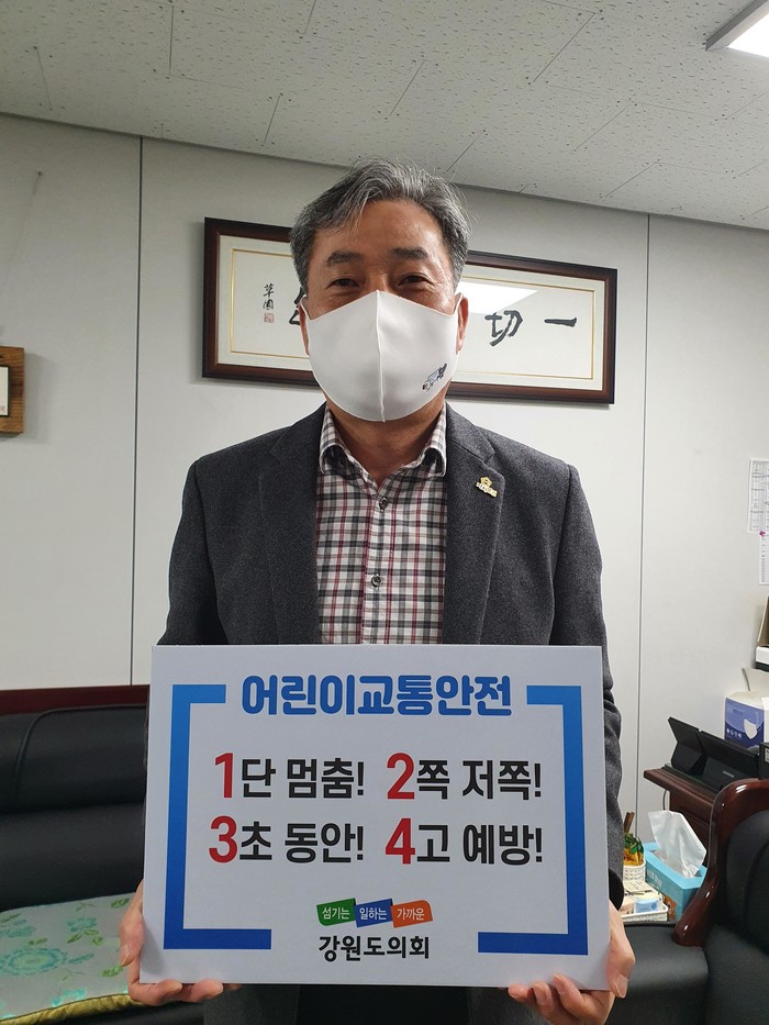 어린이보호구역 내 교통사고 예방에 대한 국민적 공감대를 형성하기 위해 행정안전부 주관으로 진행되고 있는 ‘어린이 교통안전 릴레이 챌린지’에 송광배 춘천시의원으로부터 지목받은 강원도의회 남상규 의원은 대한민국의 미래인 어린이들이 마음껏 뛰어놀 수 있는 건강하고 안전한 지역사회 조성을 위해 참여하게 되었으며,