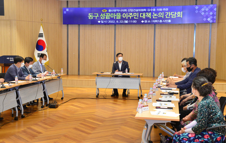 [울산 세계타임즈=이호근 기자] 울산광역시의회 김수종 의원(산업건설위원회)은 22일 오전 11시 시의회 1층 시민홀에서 ‘동구 성끝마을 이주민 대책 논의 간담회’를 개최했다.