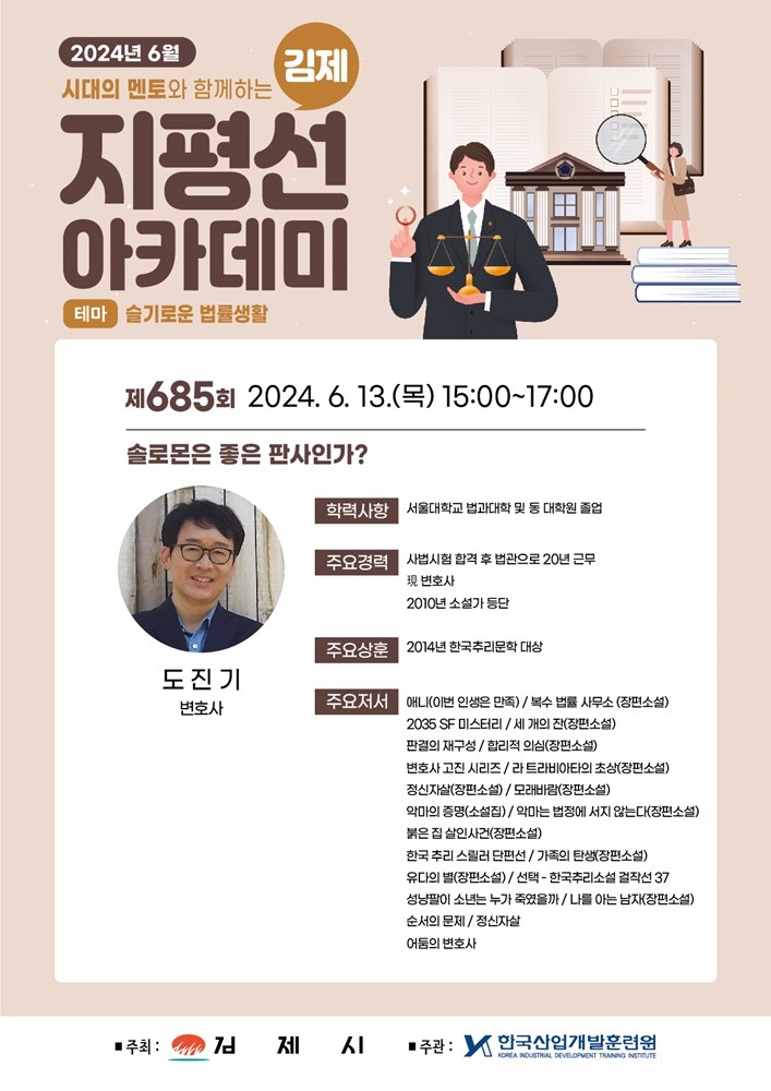 김제시(시장 정성주)는 오는 13일 제685회 지평선아카데미에 도진기 변호사를 초청해 “솔로몬은 좋은 판사인가?”라는 주제로 강연을 진행한다고 밝혔다.