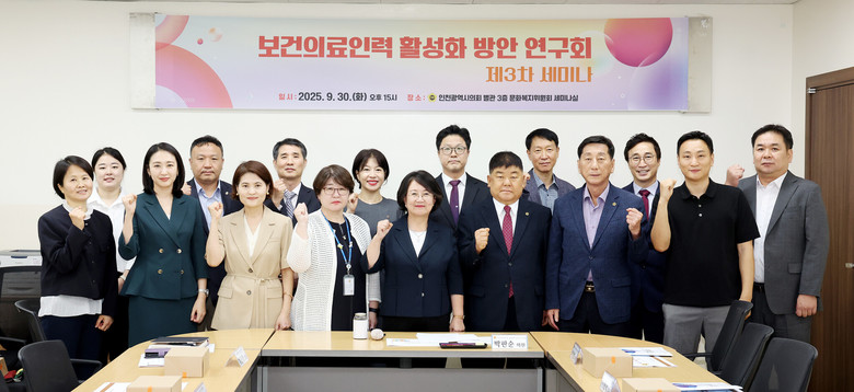 [인천 세계타임즈=심하린 기자] 인천광역시의회 의원연구단체인 ‘보건의료인력 활성화 방안 연구회(대표의원 박판순)’는 30일 문화복지위원회 세미나실에서 박판순 대표의원(국·비례)을 비롯해 박창호(국·비례)·이봉락(국·미추홀구3) 의원, ‘의료기사단체 정책연구단’관계자 등이 참석한 가운데 ‘제3차 정책 세미나’를 개최했다.