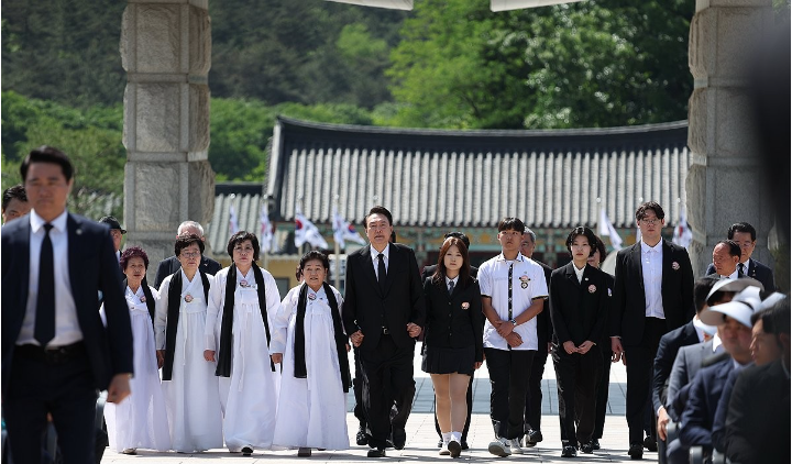 윤 대통령은 이어진 헌화·분향도 5·18 유공자 유족 및 후손 대표들과 함께했다. 5·18 민주화운동의 진실을 기리는 경과보고 역시 유공자 후손 대표인 기승현 씨, 조선대 학생 대표 안성영 씨가 진행했다.기념식에 참석한 학생들은 대통령과 유족 대표에게 오월의 의미를 담은 이팝나무 꽃다발을 각각 전달했다.윤 대통령의 기념사에서는 딱딱한 문구 대신 감정에 호소하는 표현을 강조한 부분도 눈에 띄었다.지난해에는 자유와 민주주의를 위협하는 세력에 맞서 싸워야 한다는 다소 강한 표현을 앞세웠지만, 올해 윤 대통령은 "5월 광주의 거리에 이팝나무꽃이 흐드러지게 피었다며 감성적 표현으로 말문을 열었다. 말투 역시 지난해보다 한층 차분하고 부드러워진 모습이었다.윤 대통령은 44년 전 5월, 광주시민과 학생들이 금남로에서, 도청에서 나눠 먹은 주먹밥을 닮은 새하얀 이팝나무꽃이라며 5·18 민주화운동 당시 광주 시민들이 보여준 연대의 의미를 되새겼다.윤 대통령은 여당의 4·10 총선 참패 이후 그간 일각에서 권위적이라는 지적을 받던 말투 등을 바꾸고 부드러운 소통에 노력하고 있다.윤 대통령은 기념사에서 이제 5·18의 의미가 과거의 정치적 어젠다에 머무는 대신 미래지향적 국가 발전을 위한 개념으로 확장돼야 한다는 점을 강조했다.우리 국민이 누리는 정치적 자유와 정치적 인권은 세계 최고 수준이라는 인식을 드러내면서 이제는 경제적 불평등 해소와 경제적 자유의 보장이 필요한 때라는 점을 거듭 강조했다.경제적 자유를 미래지향적으로 구현하는 데에 이른바 오월 정신이 기여해야 한다는 메시지인 셈이다.윤 대통령은 또 경제적 자유를 누리지 못하는 수많은 국민들"을 위해 빠른 경제 성장과 공정한 분배를 실현함으로써 서민과 중산층 중심 시대를 열겠다고 약속했다.총선 이후 강조해온 민생 중심 기조를 부각함과 동시에 집권 3년 차에는 민생 경제 회복에 국정 운영의 초점을 맞추겠다는 의지를 재차 밝힌 것으로 풀이된다.윤 대통령은 5·18 헌법 전문 수록에 대해서는 따로 언급하지 않았다. 윤 대통령의 기념사 도중에는 광주시의회 5·18 특위 소속 시의원 8명이 5·18 헌법 전문 수록이 쓰인 피켓을 들고 시위하면서 잠시 소란이 일기도 했다.윤 대통령은 퇴장하면서 5·18 헌법 전문 수록을 언급하는 양재혁 5·18 유족회장에게 잘 챙기겠다고 말한 것으로 전해졌다.윤 대통령은 기념식에서 5·18 민주화운동을 상징하는 님을 위한 행진곡을 오월 어머들과 양손을 잡고 앞뒤로 흔들며 함께 불렀다. 과거 보수 정부에서는 노래 제창 순서를 생략하는 등 논란도 있었지만, 윤 대통령은 3년 연속 기념식에서 이 노래를 불렀다.윤 대통령은 좌우에 착석한 유족 대표와 악수한 뒤 곧바로 국립 5·18 민주묘지 1묘역에 안장된 고 박금희, 고 김용근, 고 한강운 유공자 묘소를 찾아 참배하고 유족들을 위로했다.윤 대통령은 박금희 유공자의 언니인 박금숙 씨의 손을 잡고 건강하십시오라고 말했고, 독립 유공자이자 6·25 참전 용사이기도 한 김용근 유공자의 아들 김만진 씨에게도 위로를 전했다.민주화운동 당시 고문의 후유증으로 사망한 한강운 유공자의 아들 한선호 씨에게는 어머니 잘 모시기 바란다고 격려했다.윤 대통령은 국민의힘 황우여 비대위원장, 더불어민주당 이재명 대표, 조국혁신당 조국 대표 등 정치권 인사들과는 따로 인사를 나누지 않았다.대통령실 고위 관계자는 윤 대통령은 기념식 후 바로 민주묘지를 떠나지 않고 묘역으로 이동했다고 설명했다. 행사 진행상 자연스럽게 동선이 갈렸다는 설명이다.