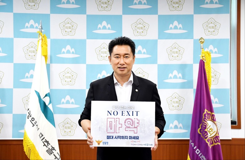 [미추홀구 세계타임즈=심하린 기자] 김재원 인천시 미추홀구의회 의원이 18일 마약범죄 예방 ‘노 엑시트(NO EXIT)’릴레이 캠페인에 동참했다.