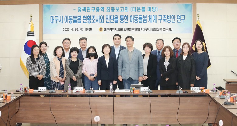 [대구 세계타임즈=한성국 기자] 대구시의회 의원연구단체 「대구시 돌봄정책 연구회」(대표 육정미 의원)는 4월 20일(목) 오후 4시 시의회 3층 회의실에서 소속 의원(대표 육정미, 간사 김태우, 류종우, 김재우, 김재용, 정일균, 하중환, 이재숙, 박종필, 권기훈, 허시영, 전경원)이 참석한 가운데 타운홀미팅 형식의 정책연구용역 최종보고회를 개최했다.
