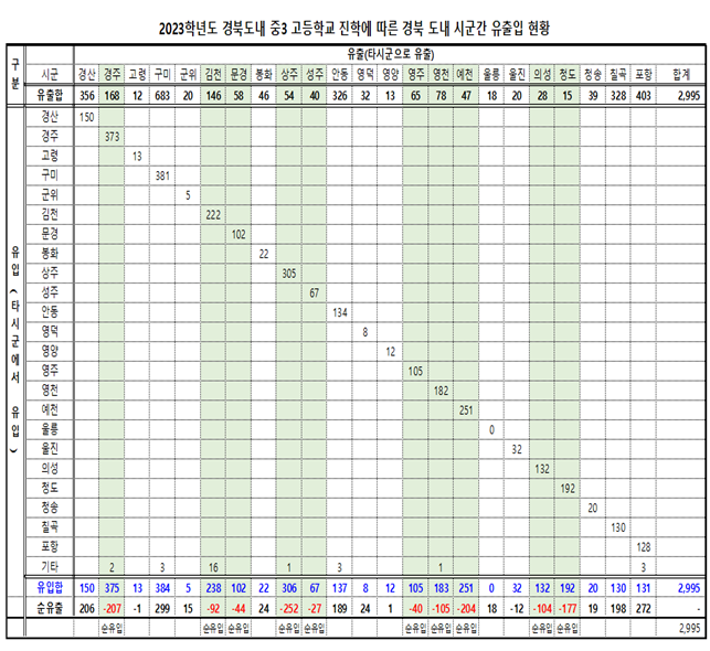 전체 3,289명 중 다른 광역시도로 진학한 294명 제외하고 경북 도내에서 시군 간 이동 진학한 학생 수는 2,995명으로 각 시군 간 유출입 학생수를 비교해 본 결과, 경산시는 다른 시군으로 356명이 유출되고 150명이 유입되어 순유출이 206명에 달했으며, 구미의 순유출은 299명, 포항 272명, 칠곡 198명, 안동 189명 등으로 순유출이 많았다.