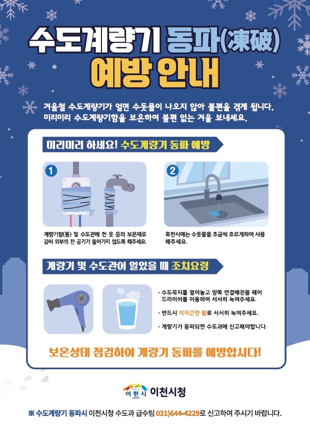 이천시는 동파 취약지역 점검과 함께 동파 예방 안내를 위한 홍보지를 배부하고 현수막을 게시하며 동파 발생 시 신속한 복구를 위한 비상근무체제에 돌입했다.