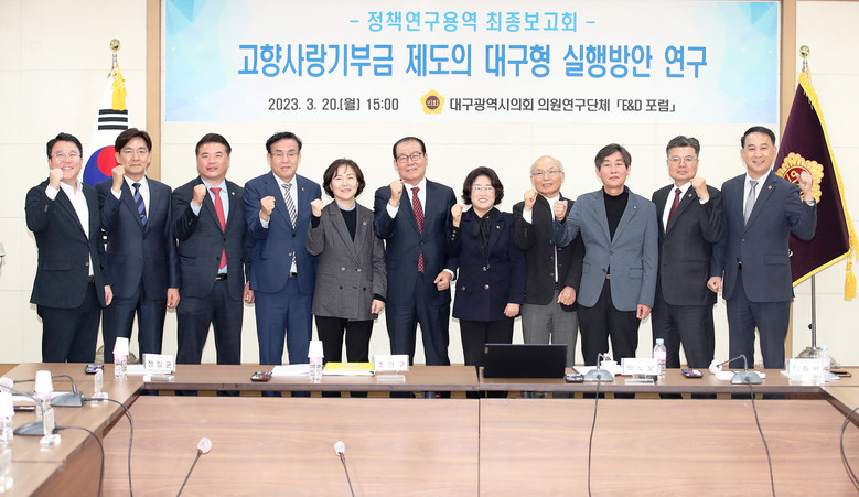 [대구 세계타임즈=한성국 기자] 대구시의회 의원연구단체 「Economy & Development 포럼(이하 E&D 포럼)」(대표 조경구 의원)은 3월 20일(월) 오후 3시 3층 회의실에서 소속단체 의원(대표 조경구, 간사 정일균, 이성오, 임인환, 김태우, 윤권근, 윤영애, 김지만, 이재화, 김원규, 이동욱, 전경원, 육정미)이 참석한 가운데 ‘고향사랑기부제의 대구형 실행방안 연구’용역 최종보고회를 개최했다.