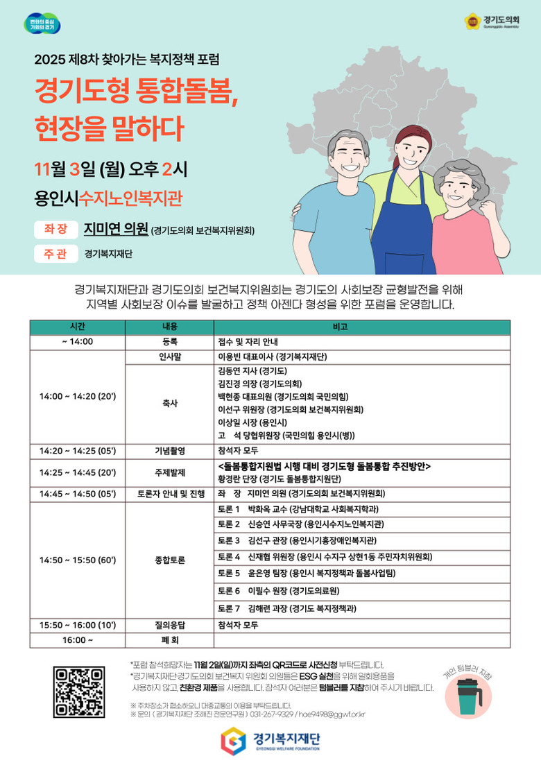 이번 포럼은 경기도의회와 경기복지재단이 공동 주최하고, 경기복지재단이 주관하는 ‘2025 찾아가는 복지정책 포럼’의 일환으로, 2026년 3월 시행을 앞둔 「의료·요양 등 지역 돌봄의 통합지원에 관한 법률」에 대응하기 위한 ‘경기도형 통합돌봄 모델’의 발전 방향을 모색하기 위해 마련됐다.