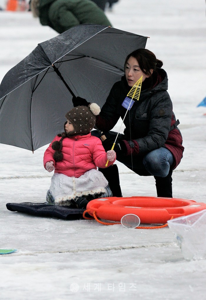2017 얼음나라 화천 산천어축제 마지막날인 5일 오후 강원 화천군 화천천 축제장 얼음낚시터에서 관광객들이 산천어 낚시를 즐기고 있다. 2017.02.05