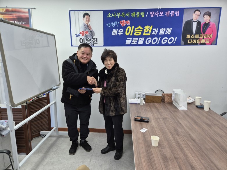 이날 4일 오후 2시 창원 로봇랜드 302호 퍼스트 코리아 김연희. 정현성 대표의 사무실에서 소나무 독서클럽 감기 봉 대표. 창조교회 이윤옥 담임목사·성도들 그리고 인기가수 배진아의 펜클럽 부회장인 박숙희 시인등 자리를 함께했다.