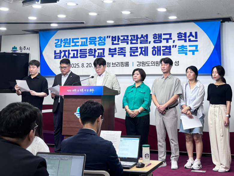 [강원도 세계타임즈=김민석 기자] 강원특별자치도의회 교육위원회 전찬성 의원(더불어민주당, 원주8)은 8월 20일 오전 원주시청 브리핑룸에서 기자회견을 열고 원주 반곡관설동, 행구동 혁신도시의 남자고등학교 부족 문제를 지적하며 이에 대한 해결 방안 마련을 촉구했다.