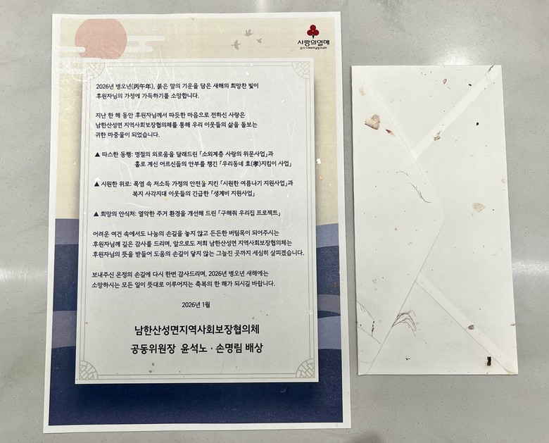 손명림 민간위원장은 “후원자들의 소중한 정성은 지역 곳곳의 그늘진 이웃에게 희망을 전하는 마중물이 됐다”며 “보내주신 온정에 깊이 감사드리며, 2026년에도 복지 사각지대 없는 남한산성면을 만들기 위해 위원들과 함께 최선을 다하겠다”고 말했다.
