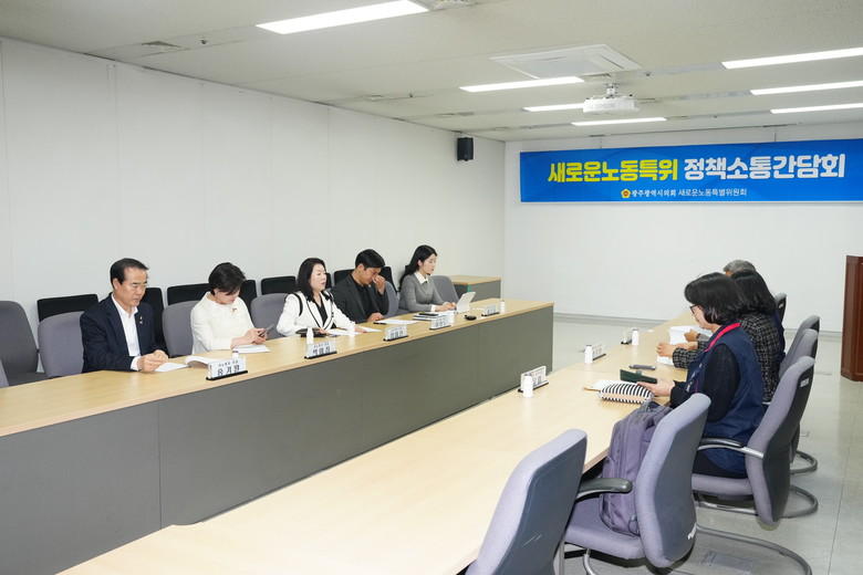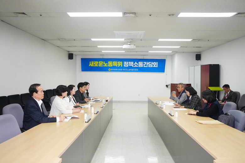 [광주 세계타임즈=손권일 기자] 광주광역시의회 새로운노동특별위원회(위원장 채은지, 이하 새노동특위)는 9일 민주노총 관계자들과 ‘정책소통간담회’를 개최하여 광주시 노동 현실에 대해 의견을 나누었다.