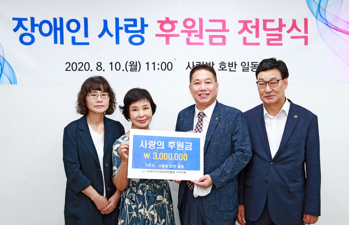 사랑방 호반(문학모임 - 회장 김혜련)은 코로나19로 어려움을 겪고 있는 장애인을 응원하고자 (사)대구시지체장애인협회 서구지회에 ‘사랑의 후원금(300만원)’을 전달했다.
