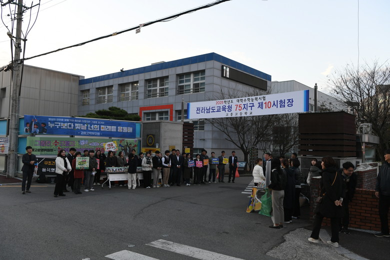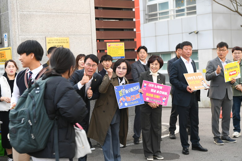 [고흥군 세계타임즈=우덕현 기자] 고흥군의회(류제동 의장)는 14일 이른 아침 의장단과 각 상임위원회 의원 및 의회사무과 공직자들과 함께 2025학년도 대학수학능력시험이 치러지는 고흥고등학교를 방문해 수험생과 학부모에 대한 응원과 격려 행사를 진행했다.