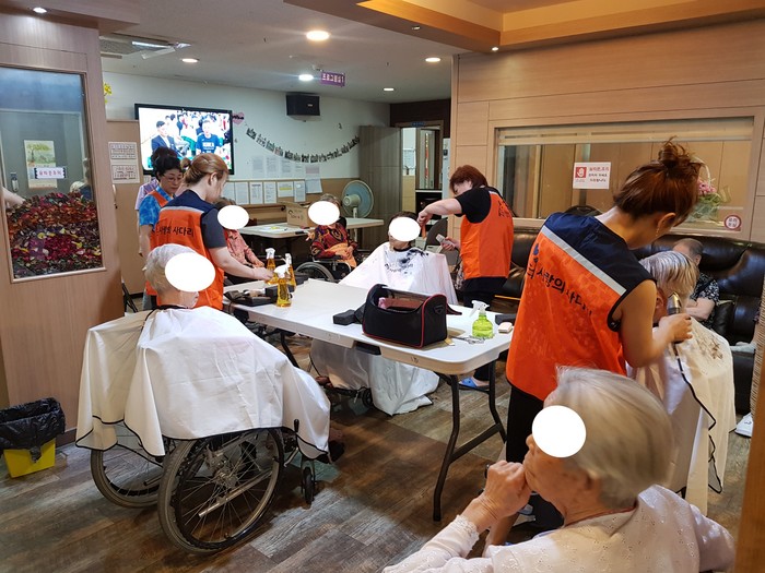 이날 미용봉사는 박유신(머리만들기, 와동), 윤성애(가위소리, 덕암동), 이미향(투투미용실, 가양동), 채경숙(채련화미용실, 중리동)등 미용실을 운영하는 회원들이 생업을 잠시 미루고 요양원1,2층과 별관에서 미용봉사를 하였다,