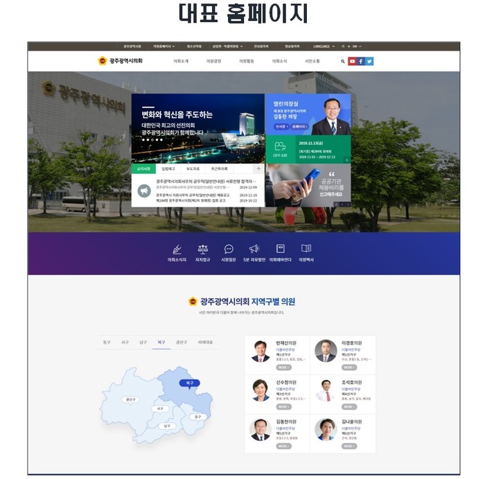 그리고 지역주민을 대표하는 지역구 의원들을 한눈에 쉽게 검색할 수 있도록 홈페이지 메인화면에 광주시 도시지도와 함께 지역구 의원들의 사진을 배치함으로써 의원들의 의정활동에 대한 시민 모니터링이 더욱 용이할 수 있도록 개선됐다.