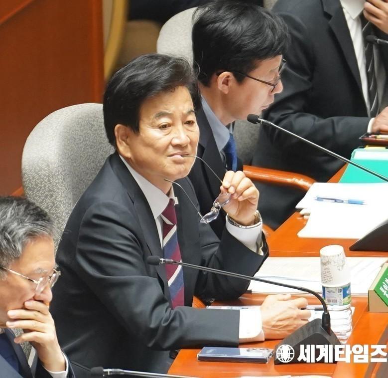 '정동영'통일부 장관이 25일 국회에서 열린 예산결산특별위원회 전체 회의에서 생각에 잠겨있다.
