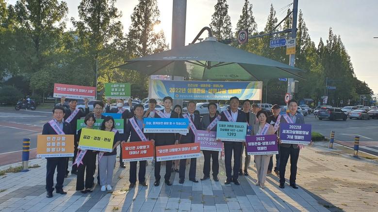 이번 캠페인은 도의회 사회복지연구회와 자살예방협회(회장 김형준)가 공동으로 주최하였으며, 대학생 자원봉사자가 함께하였다.