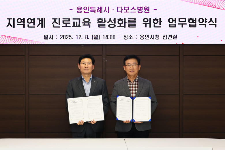 이날 이상일 시장과 양성범 다보스병원 이사장은 시청 시장접견실에서 ‘지역연계 진로교육 활성화를 위한 업무협약’을 맺었다.