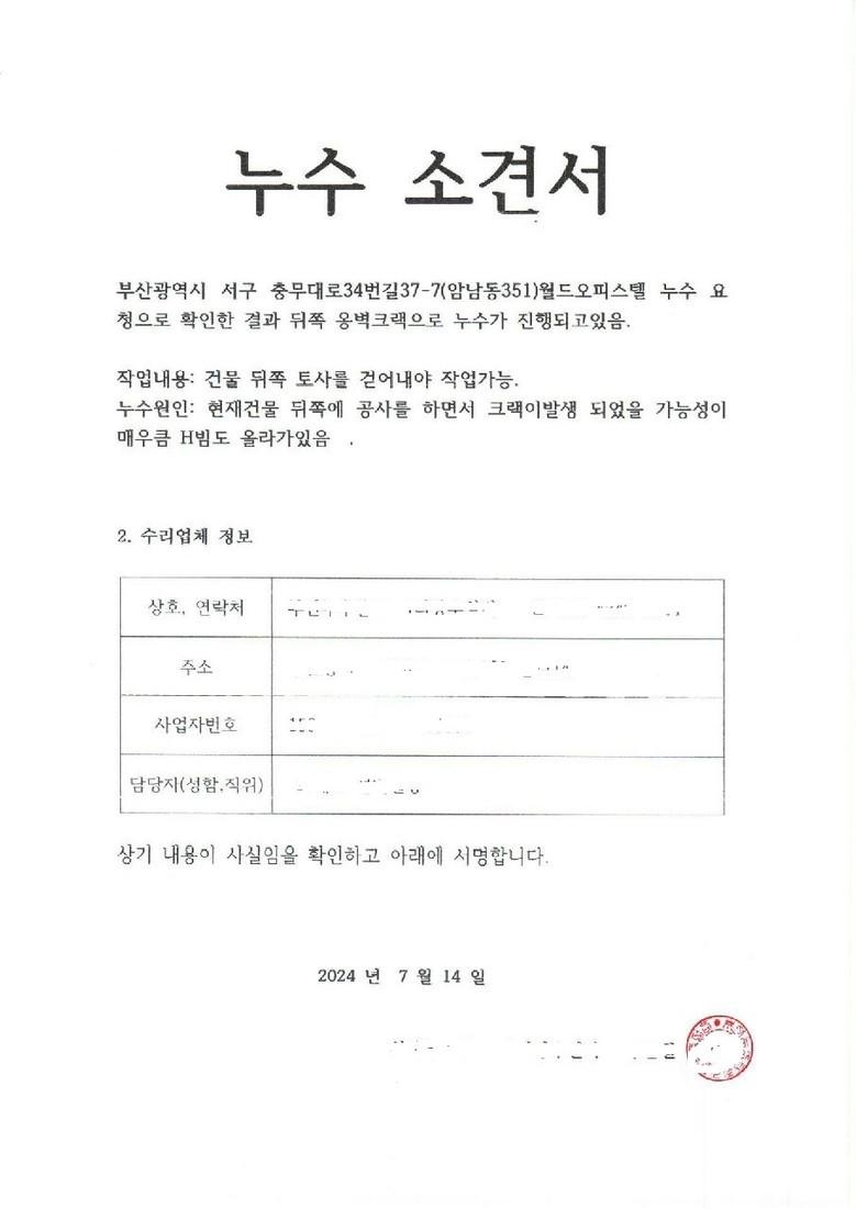 [세계타임즈 = 이진화 기자] 부산광역시 서구 암남동 소재 월드오피스텔 지하실에 '심각한 누수와 곰팡이′의 발생 때문에 전문업체의 확인한 결과 뒤쪽 옆 건물 신축 공사현장 방향 옹벽크랙으로 누수가 진행되고 있는 것으로 알려져 지하실 입주민이 반발하고 나섰다.