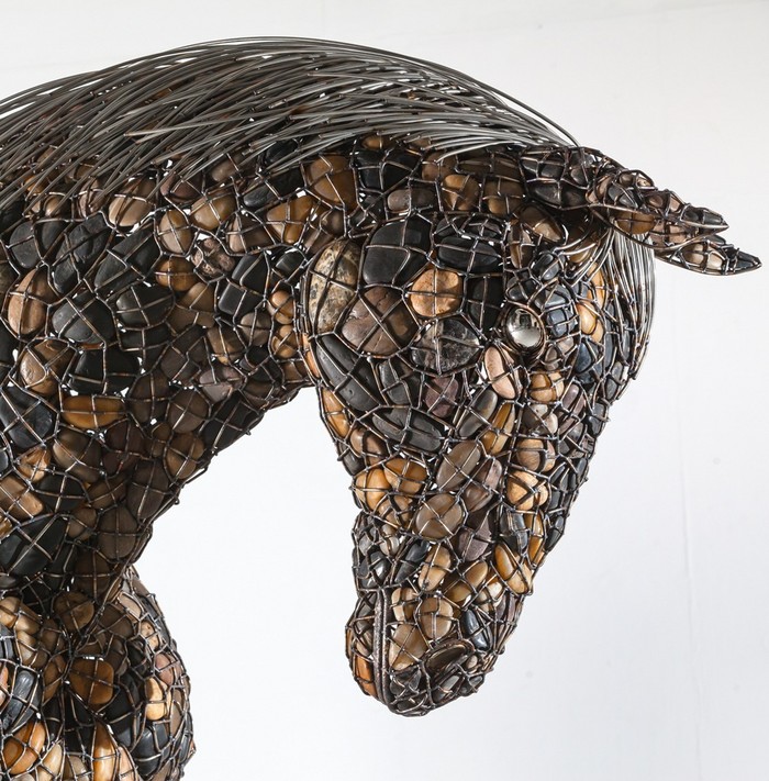 손 안에 쥐어질 정도의 작은 돌멩이들을 금속줄로 촘촘히 엮어 표현한 말, 흑표범, 코뿔소와 같은 동물 혹은 포효하는 인간은 돌이라는 재료만큼이나 육중한 무게감으로 주제를 전달한다. 작은 세포들이 모여 경이로운 생명을 이루는 것처럼 자연에 대한 경외감을 불러일으키기에 충분하다.