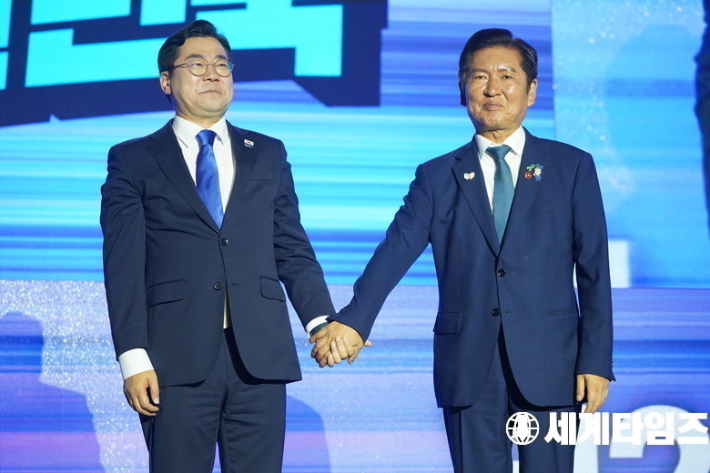 '정청래'(신임 더불어민주당 대표가 2일 경기도 고양시 킨텍스에서 열린 전국당원대회에서 선의의 경쟁을 펼쳤던 '박찬대' 의원과 손을 맞잡고있다.
