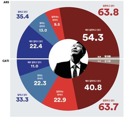 [세계타임즈 = 심귀영 기자] 윤석열 대통령 국정운영 평가에서 ARS 조사 결과 굴종 외교 및 일제강점기 강제동원 제3자변제안에 대한 반발과 주 69시간 근로시간 개편안에 대한 논란 등이 이어져 ‘긍정’ 평가는 3월 조사 이후 하락 흐름이 지속되며 30%대의 낮은 지지율이 유지되었다.