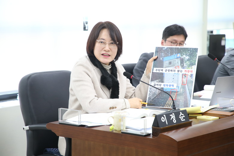 [남동구 세계타임즈=심하린 기자] 남동구의회 이정순 의원(더불어민주당, 구월2동,간석2‧3동)은 지난 24일 남동구의회 2023년도 행정사무감사에서 수년째 운영하지 않고 있는 가로판매대에 적절한 행정조치를 하지 않는 해당부서를 지적했다.
