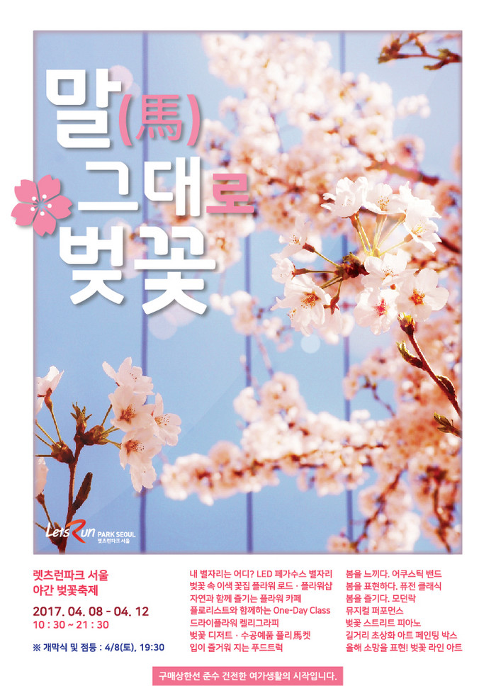 이에 고중환 렛츠런파크 서울 본부장은 “아름다운 벚꽃을 이용해 고객들에게 잊지 못할 추억을 선물하고 싶다”면서, “야간벚꽃축제를 통해 렛츠런파크 서울이 전국적인 벚꽃 명소로 자리 잡을 수 있길 희망한다”고 소감을 밝혔다.