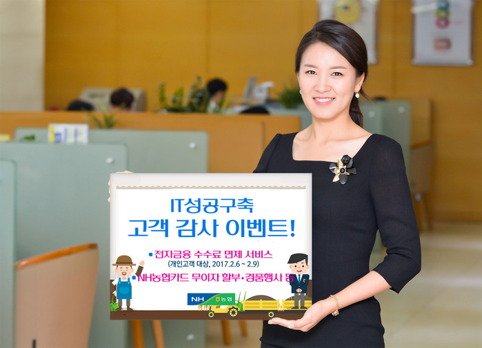 이벤트는 2월 6일부터 9일까지 4일 동안 농협 자동화기기(CD, ATM)를 통한 출금 및 타행이체 수수료, 인터넷·스마트·텔레뱅킹 타행이체 수수료 등 전자금융 수수료를 면제한다.