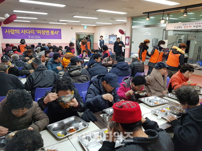나눔봉사단 이미화 감사는 “짜장면을 2그릇씩 맛있게 드시는 어르신들을 보면서 주방에서 기쁜 마음으로 설거지 봉사를 하였다.“고 말했다