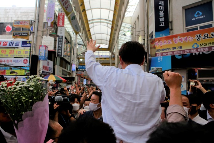 창원 반송시장을 찾아 상인들과 인사하는 윤석열