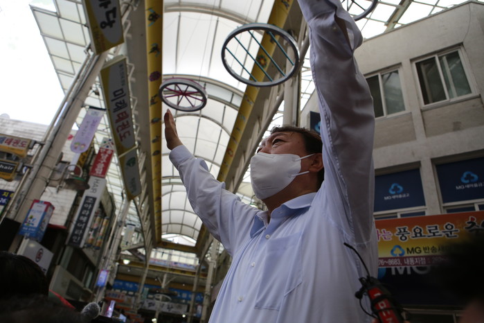[세계타임즈 이진화 기자]야권 유력대선 후보 국민의힘 윤석열 후보가 추석을 앞두고 경남지역 민심 끌어안기에 방문한 18일 오후경남 창원 반송시장을 찾아 손을 번쩍 들고 시민들을 향해 인사를 하고 있다.