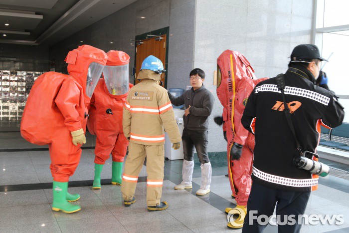 (안산=포커스뉴스) 20일 오전 안산시 상록구 사동 경기테크노파크의 한 업체에서 세정기 세정작업중 불산이 노출되어 약36명이 가스를 흡입해 치료중이며, 1000여명이 대피한 가운데 현장에 도착한 119대원들이 유해물질을 제거하고 있다. <사진제공=안산소방서>