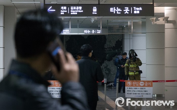 (서울=포커스뉴스) 29일 오전 8시 58분께 서울 강서구 지하철 9호선 마곡나루역 지하 기계실에서 화재가 발생해 소방당국과 역 관계자들이 화재진압 및 현장정리를 하고 있다. 이번 화재로 무정차 통과했던 열차들은 오전 10시 15분 정상운행이 재개됐다.