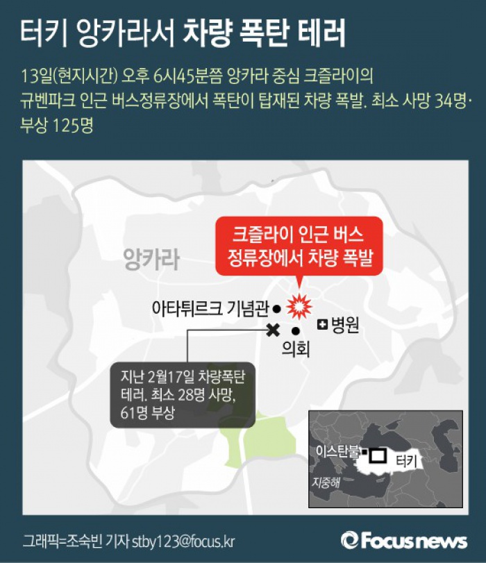 (서울=포커스뉴스) 13일(현지시간) 터키 수도 앙카라의 크즐라이 지역의 규벤파크 인근 버스정류장에서 폭탄이 탑재된 차량이 폭발해 최소 34명이 사망하고 125명이 부상을 입었다.
