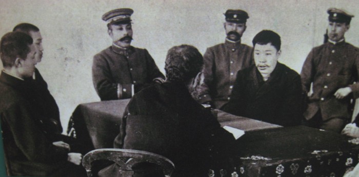 <김월배 다롄 외국어대학 뤼순일아감옥구지박물관(旅顺日俄监狱旧址博物馆) 초빙연구원>1910년 3월10일 중국 뤼순감옥 면회실에서 안중근 의사(오른쪽에서 두번째)가 동생 정근, 공근 형제, 빌헬름 신부(뒷모습)를 만나 마지막 유언을 남기고 있는 모습을 담은 기록사진. <사진제공=김월배 다롄 외국어대학 뤼순일아감옥구지박물관 초빙연구원>이토 히로부미(왼쪽에서 두번째 모자를 벗는 사람)가 1909년 10월26일 중국 하얼빈역에 도착한 모습. 안중근 의사에게 저격되기 전 모습이다. <사진제공=김월배 다롄 외국어대학 뤼순일아감옥구지박물관 초빙연구원>김월배 다롄 외국어대학 뤼순일아감옥구지박물관 초빙연구원. <사진제공=김월배 초빙연구원>