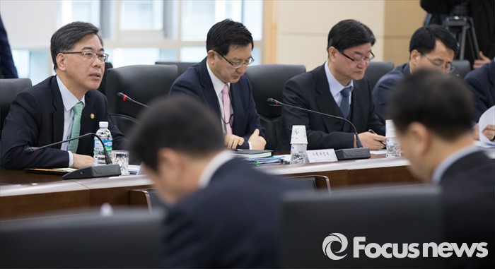 금융공기업들은 "전국금융산업노동조합(금융노조)와 산별교섭은 시한을 예측하기 힘들다"며 "기한내에 성과연봉제를 도입하지 않으면 경영평가에서 불이익을 받는다"라고 탈퇴 이유를 전했다.(세종=포커스뉴스) 송언석 기획재정부 2차관이 지난 2월 11일 오전 세종시 정부세종청사 기재부 대회의실에서 열린 제1차 공공기관 성과연봉제 추진 점검회의를 주재 하고 있다. 김기태 기자