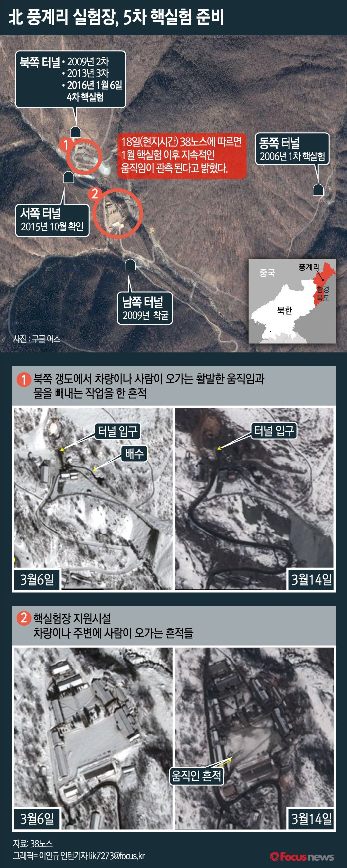 북쪽 터널은 북한이 지난 1월 4차 핵실험을 진행한 곳이다. 터널 입구 중 하나는 지난 2013년 3차 핵실험 이후 방사성 물질 누출을 막기 위해 봉쇄된 상태다.