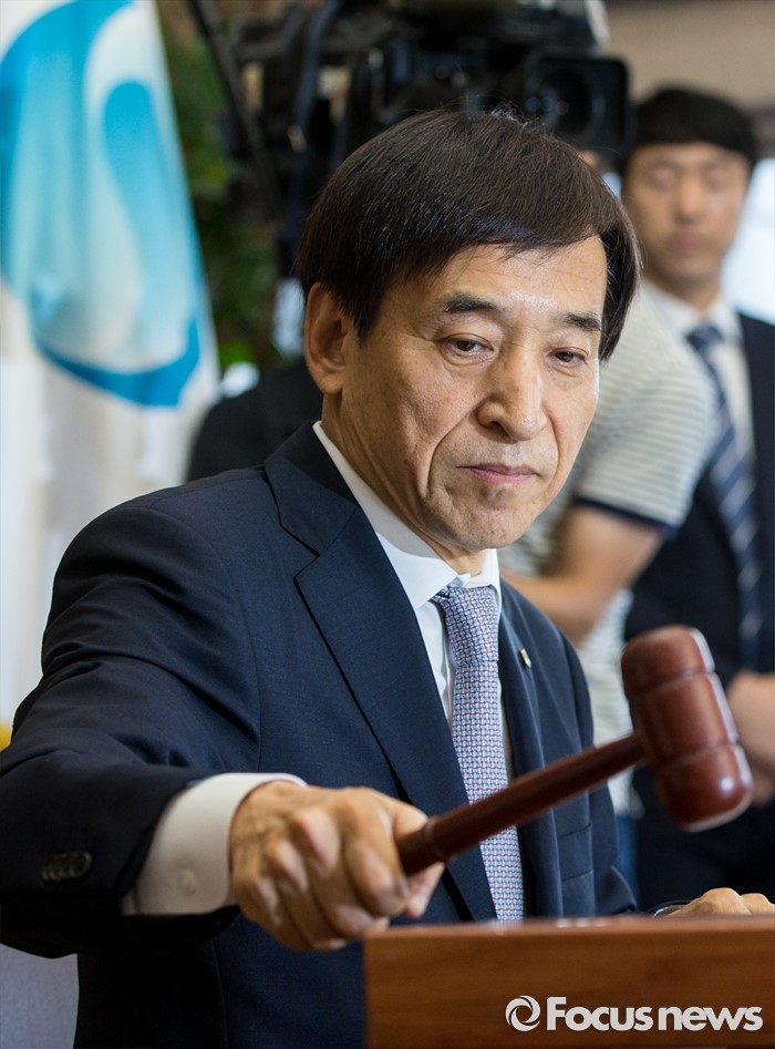 (서울=포커스뉴스) 14일 오전 서울 중구 한국은행에서 열린 제14차 금융통화위원회의에 참석한 이주열 한국은행 총재가 개회를 알리는 의사봉을 두드리고 있다.