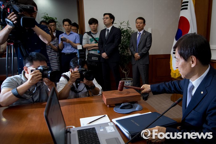 (서울=포커스뉴스) 14일 오전 서울 중구 한국은행에서 열린 제14차 금융통화위원회의에 참석한 이주열 한국은행 총재가 개회를 알리는 의사봉을 두드리고 있다.